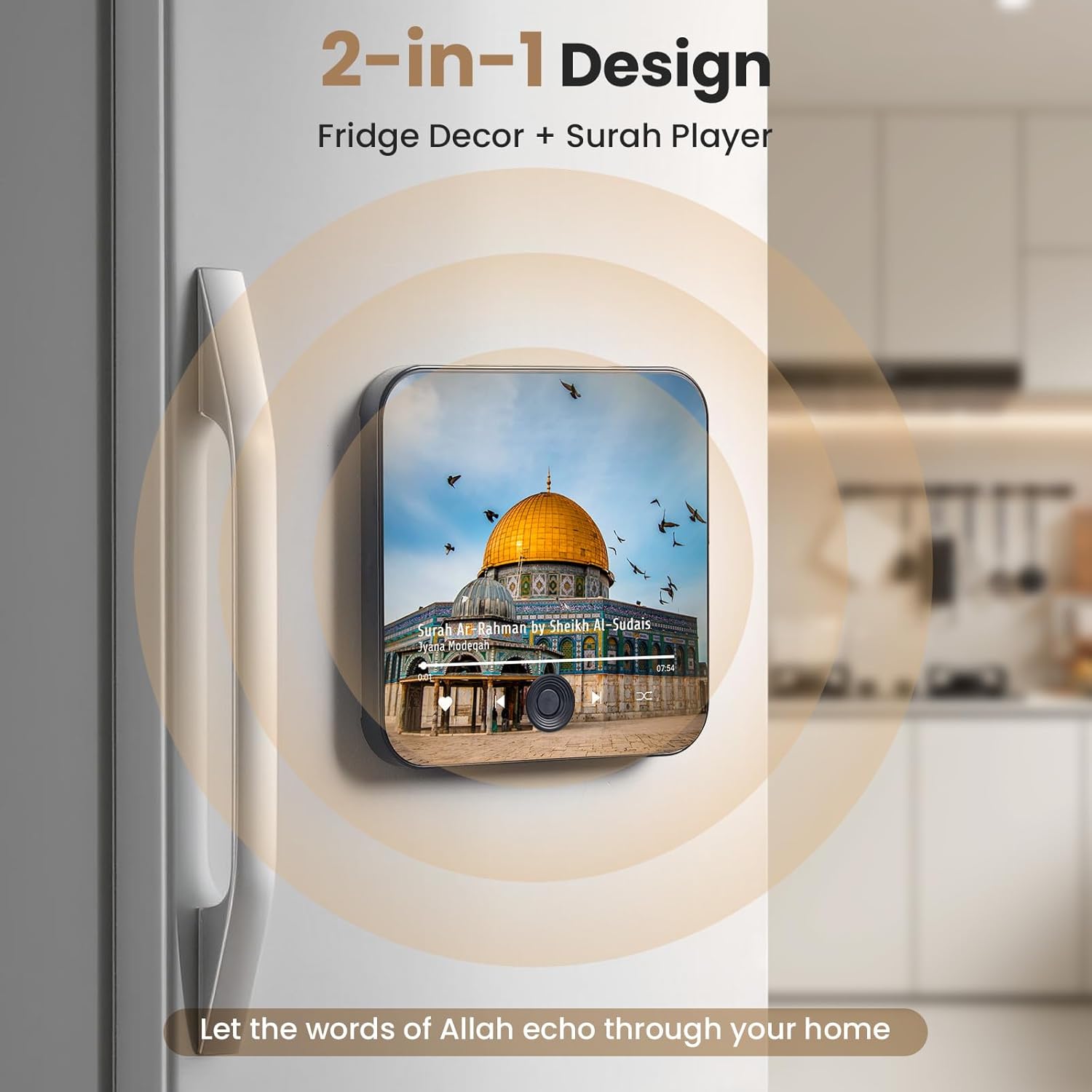 اجمع بين الجمال والروحانية في قطعة واحدة. سماعة القرآن المغناطيسية للثلاجة ليست مجرد لمسة ديكور تضيف أناقة لمطبخك، بل هي جهاز عملي يملأ المكان بتلاوات قرآنية نقية تُضفي جوًا من السكينة والراحة. بمجرد تشغيلها، ستشعر بأن منزلك أصبح أكثر دفئًا وبركة. مثالية للاستخدام اليومي أثناء الطهي، وفي الجلسات العائلية، وفي أوقات الذكر والتأمل، لتبقى كلمات الله دائمًا قريبة من قلبك وحياتك.